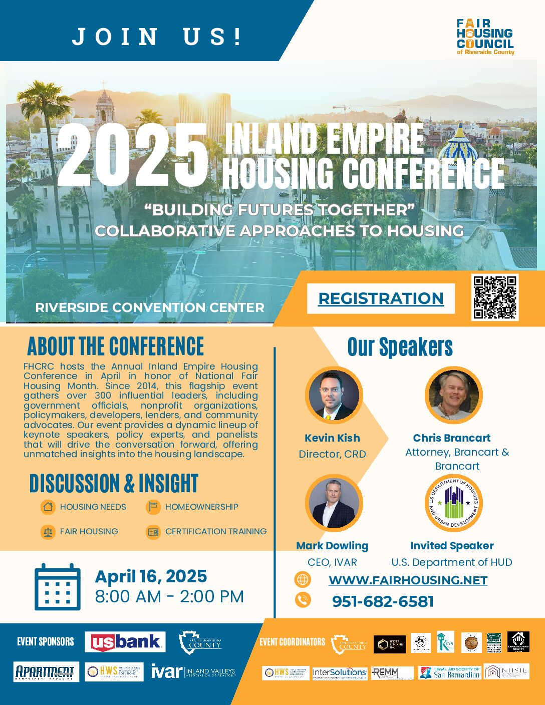 The Fair Housing Council of Riverside County, Inc. (FHCRC) will host the 2025 Inland Empire Housing Conference on Wednesday, April 16, 2025, in honor of National Fair Housing Month and the 57th anniversary of the Fair Housing Act. The theme for the conference this year is “Building Futures Together” Collaborative Approaches to Housing.